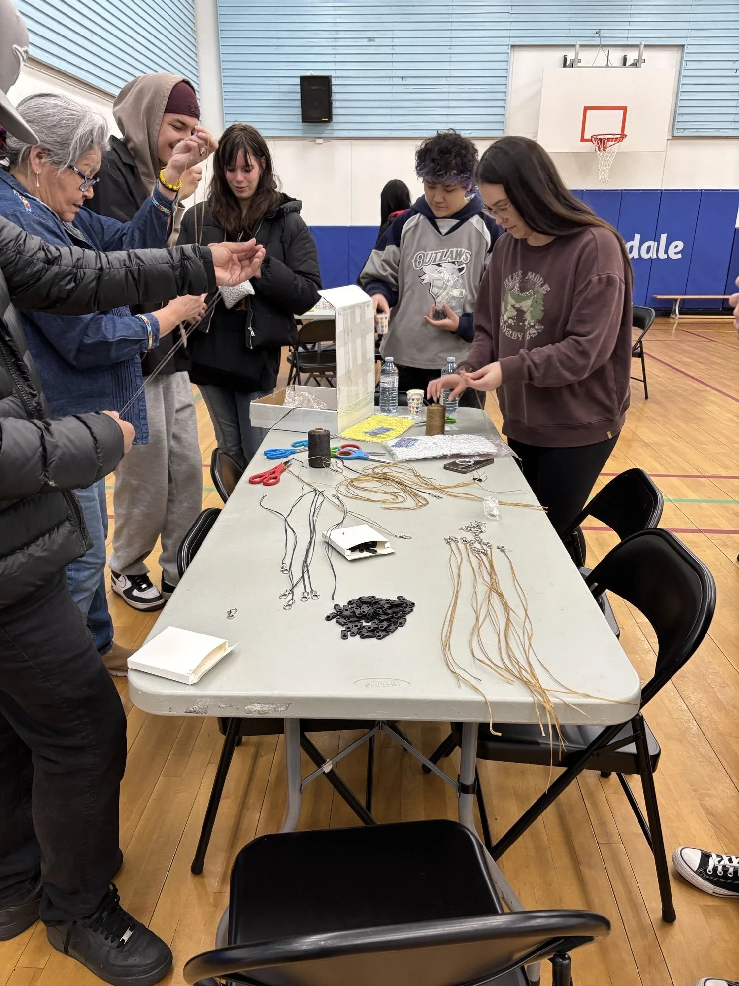 On Wednesday, January 14, seven of our students were enthusiastically welcomed by the grade 5/6 class at Riverdale School to lead a beading workshop. It was truly inspiring to witness youth learn and collaborate to support one another to create lanyards using colours of the medicine wheel. Thank you to Karen, Monica and to Roxanne for coordinating this get together between our two schools.